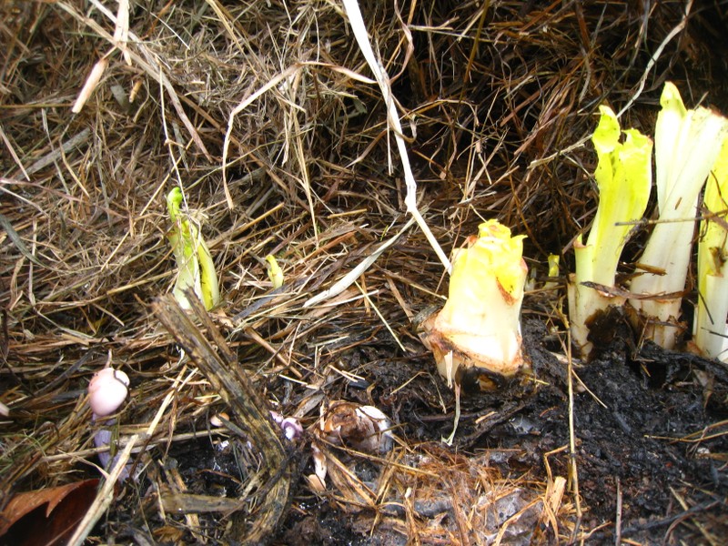 En novembre, j’ai coupé tout le feuillage de la chicorée que j’ai donné aux poules puis ai recouvert la planche de culture d’environ vingt centimètres de foin.