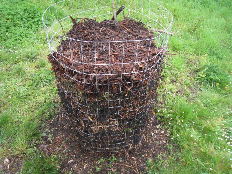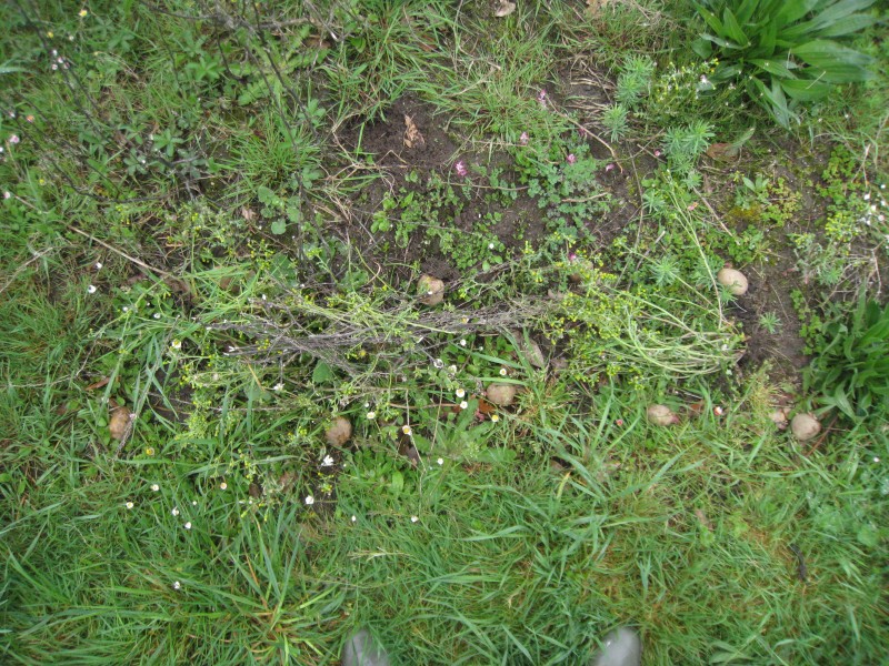 Nous avons également mis en place deux rangées de pommes terre, toujours sans travail du sol avec la technique des lasagnes : les semences sont posées à même le sol, recouvertes d’herbes coupées (ici des orties et du gaillet graterons) puis de broyat de bois.
