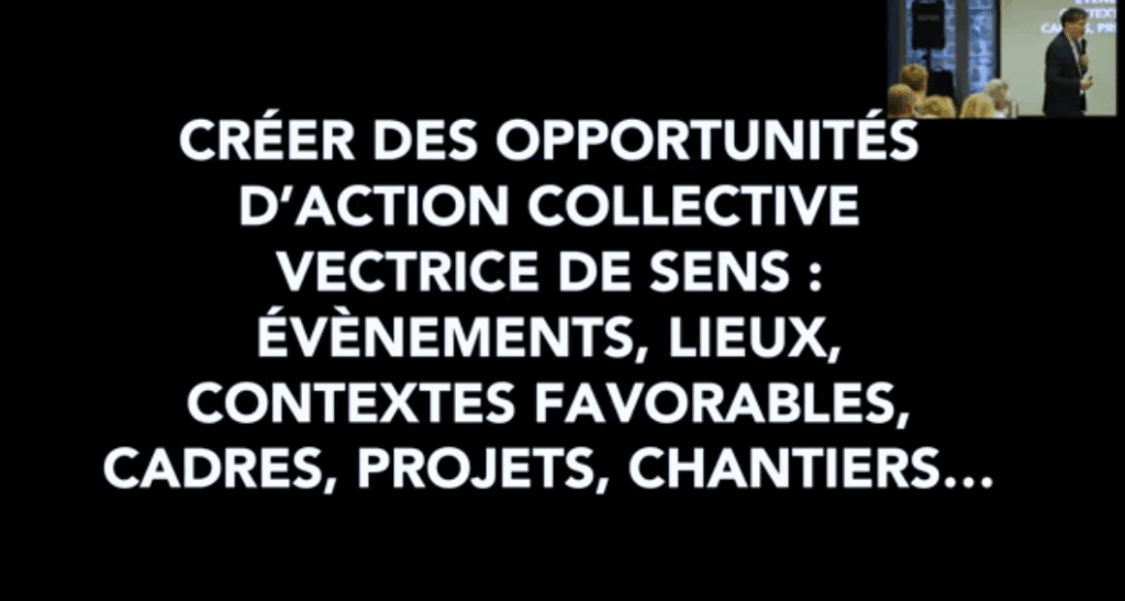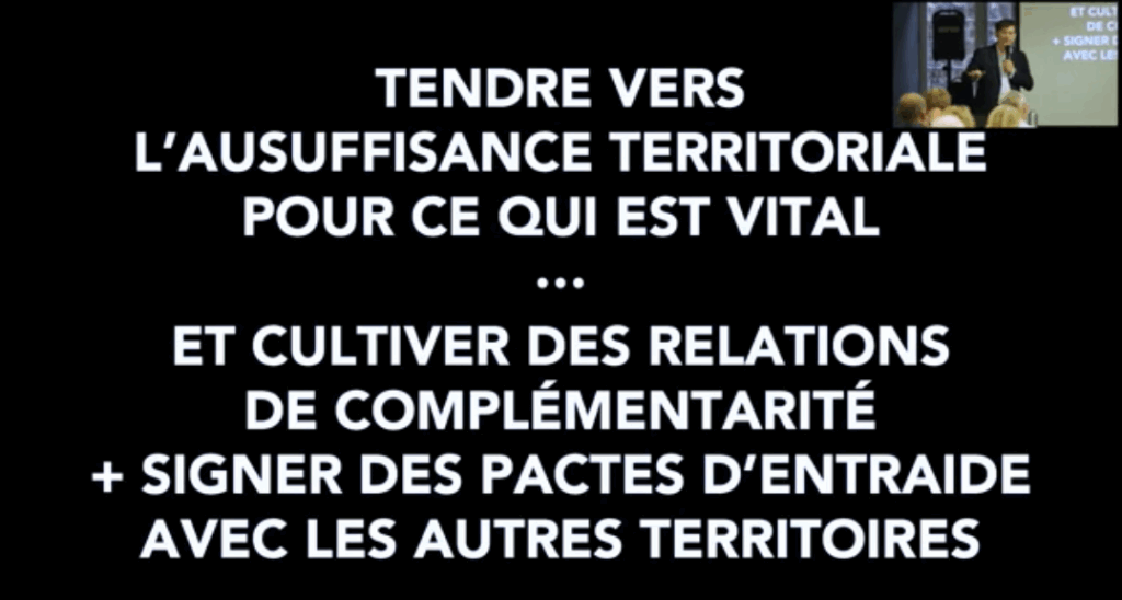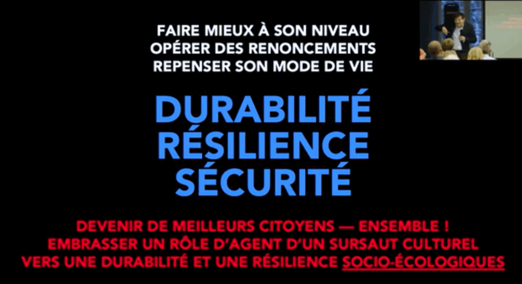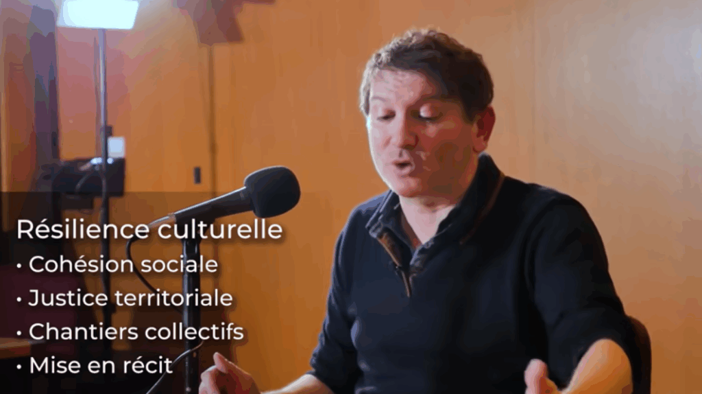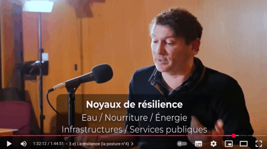 Il convient d’établir une résilience culturelle, basée sur la cohésion sociale, la justice territoriale, les chantiers collectifs et la mise en récits. Il ne s’agit pas de continuer différemment mais de repenser des actions différentes en s’adaptant à la contrainte. Le noyau de la résilience se base sur l’eau, la nourriture, l’énergie, les infrastructures et les services publiques.