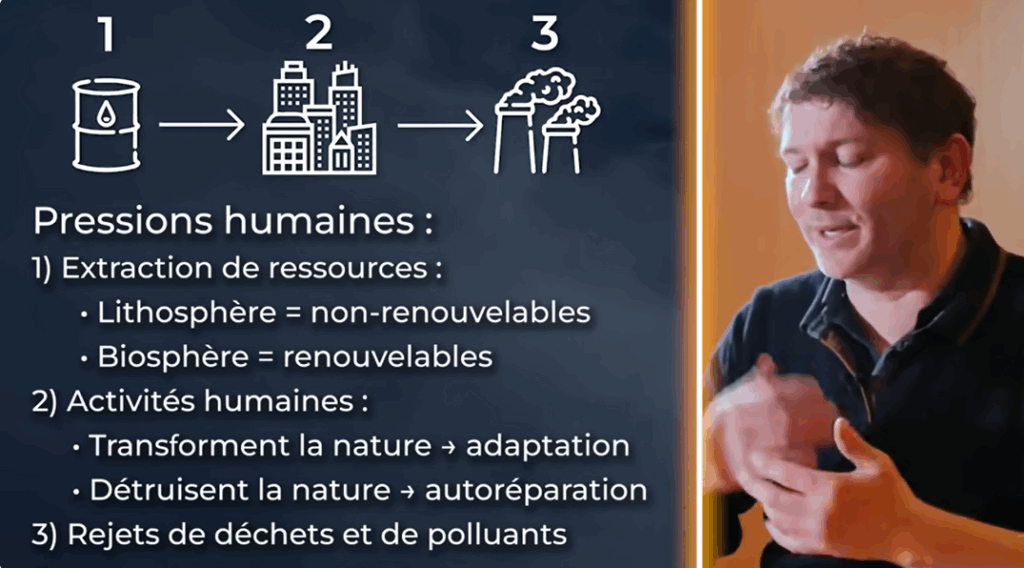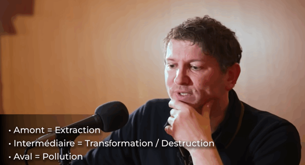 Notre société extrait des ressources issues du vivant (biosphère) ou de l’abiotique (minéraux & métaux, stock non renouvelable), transforme et jette sous forme de déchets ou de polluants.